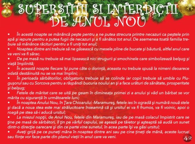 Nu sunt de uitat nici supersti iile și interdic iile din această perioadă, legate de Anul Nou: • Noaptea dintre ani trebuie să ne găsească cu mesele pline de bucate și băutură, altfel anul care • În noaptea dintre ani nu se plânge și nu trebuie să fim supăra i pentru a nu avea necazuri și