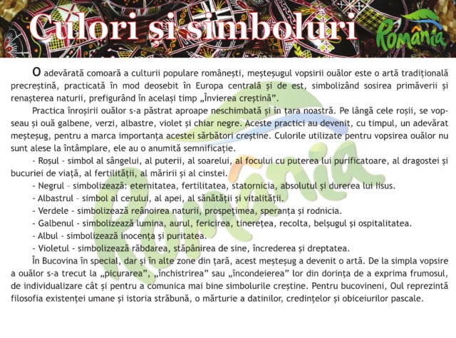 de individualizare cât şi pentru a comunica mai bine simbolurile creştine. Pentru bucovineni, Oul reprezintă şi cunoaştere; linia ondulată - apă, purificare; spirala - timp, eternitate; dubla spirală - legătura dintre viaţă Pentru a afla mai multe despre arta încondeierii ouălor, precum și despre simbolistica utilizată de meșter