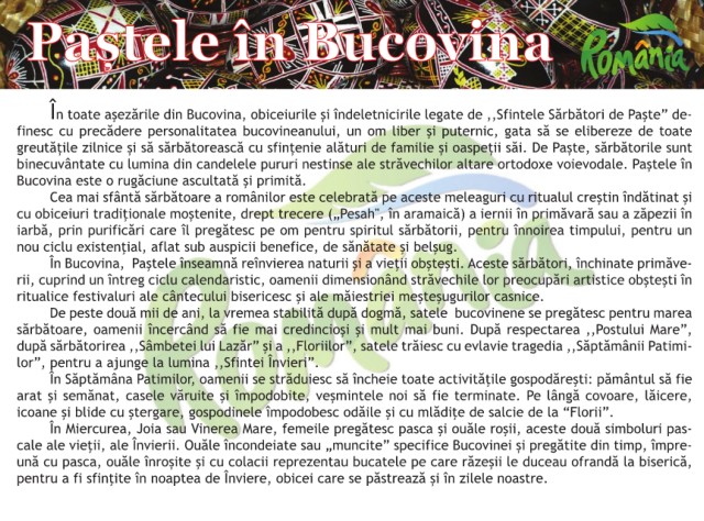cale ale vieţii, ale Învierii. Ouăle încondeiate sau „muncite” specifice Bucovinei și pregătite din timp, împre- pentru a ne bucura din plin de frumoasele locuri și de ospitalitatea gazdelor.