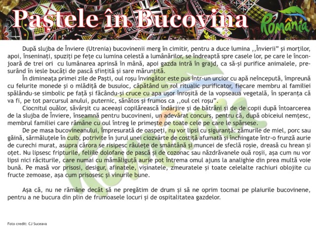 cale ale vieţii, ale Învierii. Ouăle încondeiate sau „muncite” specifice Bucovinei și pregătite din timp, împre- pentru a ne bucura din plin de frumoasele locuri și de ospitalitatea gazdelor.