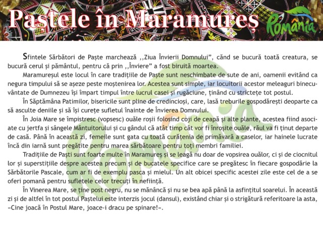 Tradițiile de Paști sunt foarte multe în Maramureș și se leagă nu doar de vopsirea ouălor, ci și de ciocnitul Tot în această zi, la miezul nopții, maramureșenii merg la biserică pentru a asista la slujba Învierii Dom- În aceste zile de sărbătoare trebuie să fim buni, iertători, să ne ne gândim numai la lucruri frumoase și