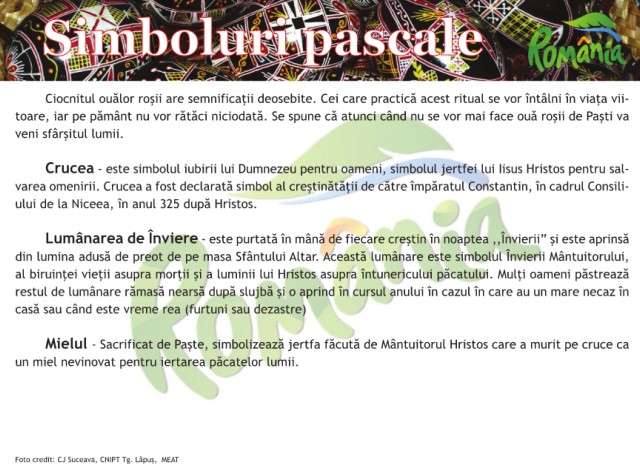 devenit o artă. De la simpla vopsire a ouălor s-a trecut la „picurarea”, „închistrirea” sau „încondeierea” lor Mielul - Sacrificat de Paște, simbolizează jertfa făcută de Mântuitorul Hristos care a murit pe cruce ca