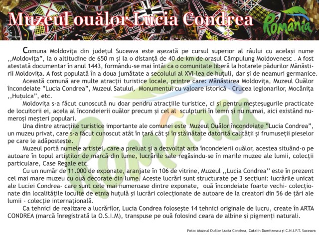 cel mai mare muzeu cu ouă decorate din lume. Aceste lucrări sunt structurate pe 3 secțiuni: lucrările unicat